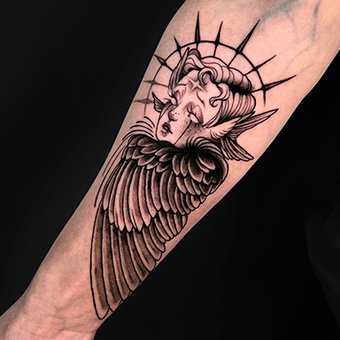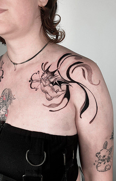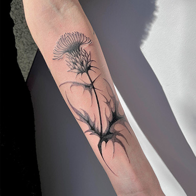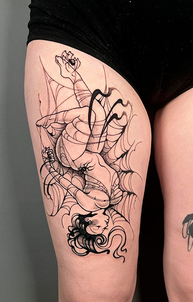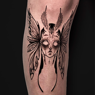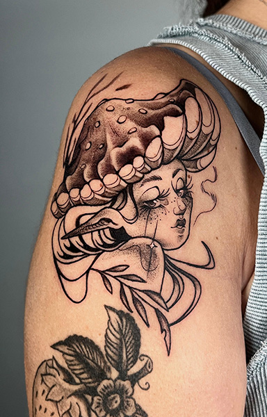 Ariax, tatuadora residente en The BlueMonkey Getafe, es una maestra del Blackwork. Su estilo único combina la intensidad del negro con detalles precisos, creando piezas personalizadas que transforman la piel en verdaderas obras de arte. Echa un vistazo a sus diseños disponibles en su Instagram